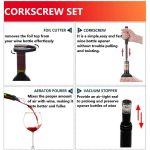 Táto 4-v-1 sada obsahuje otvárač s pumpou na vzduch, orezávač fólie, prevzdušňovač a vákuovú zátku pre dokonalý zážitok z vína.
