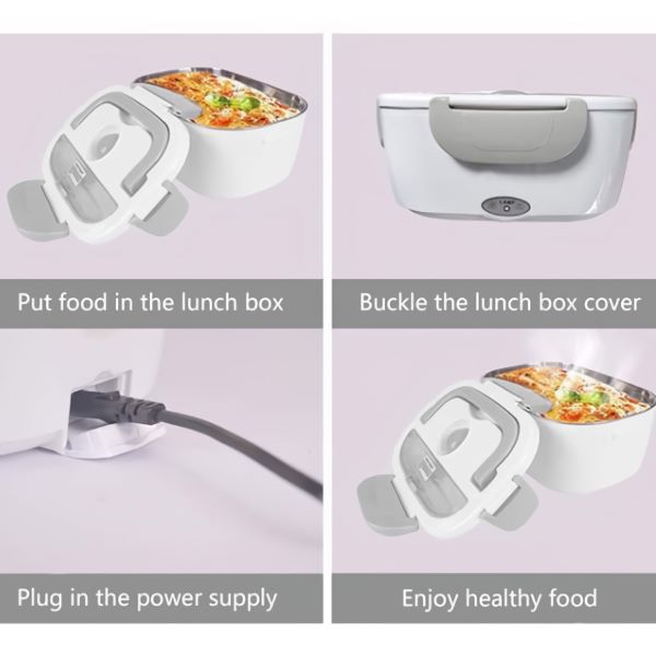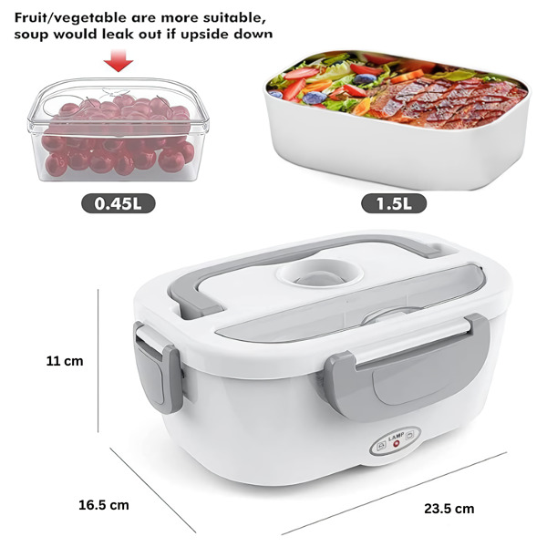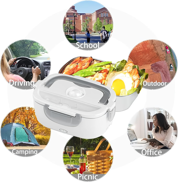 Dve vyberateľné PP priehradky udržia vaše hlavné jedlo a prílohu oddelené – a obe idú potom rovno do umývačky riadu. Funguje v kancelárii, v aute, na stavbe alebo v akejkoľvek miestnosti so zásuvkou.